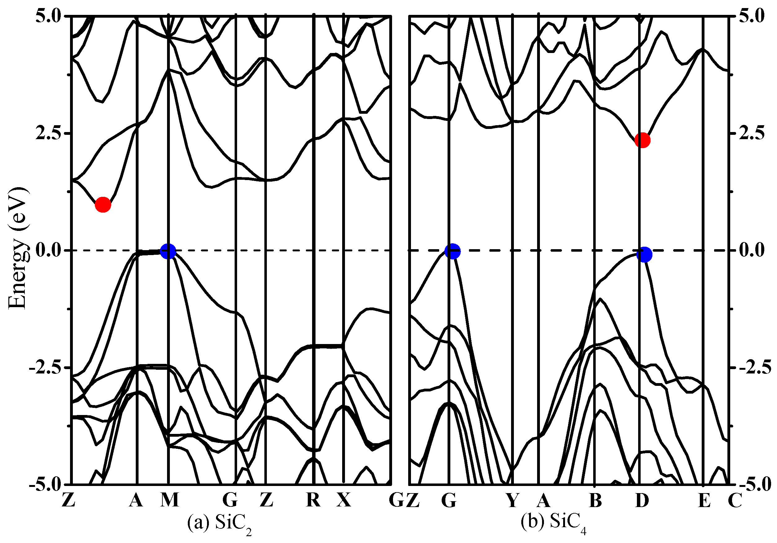 Electronic band structures of SiC2 (a) and SiC4 (b). The red and blue points indicate the conduction band minimum and valence band maximum, respectively.