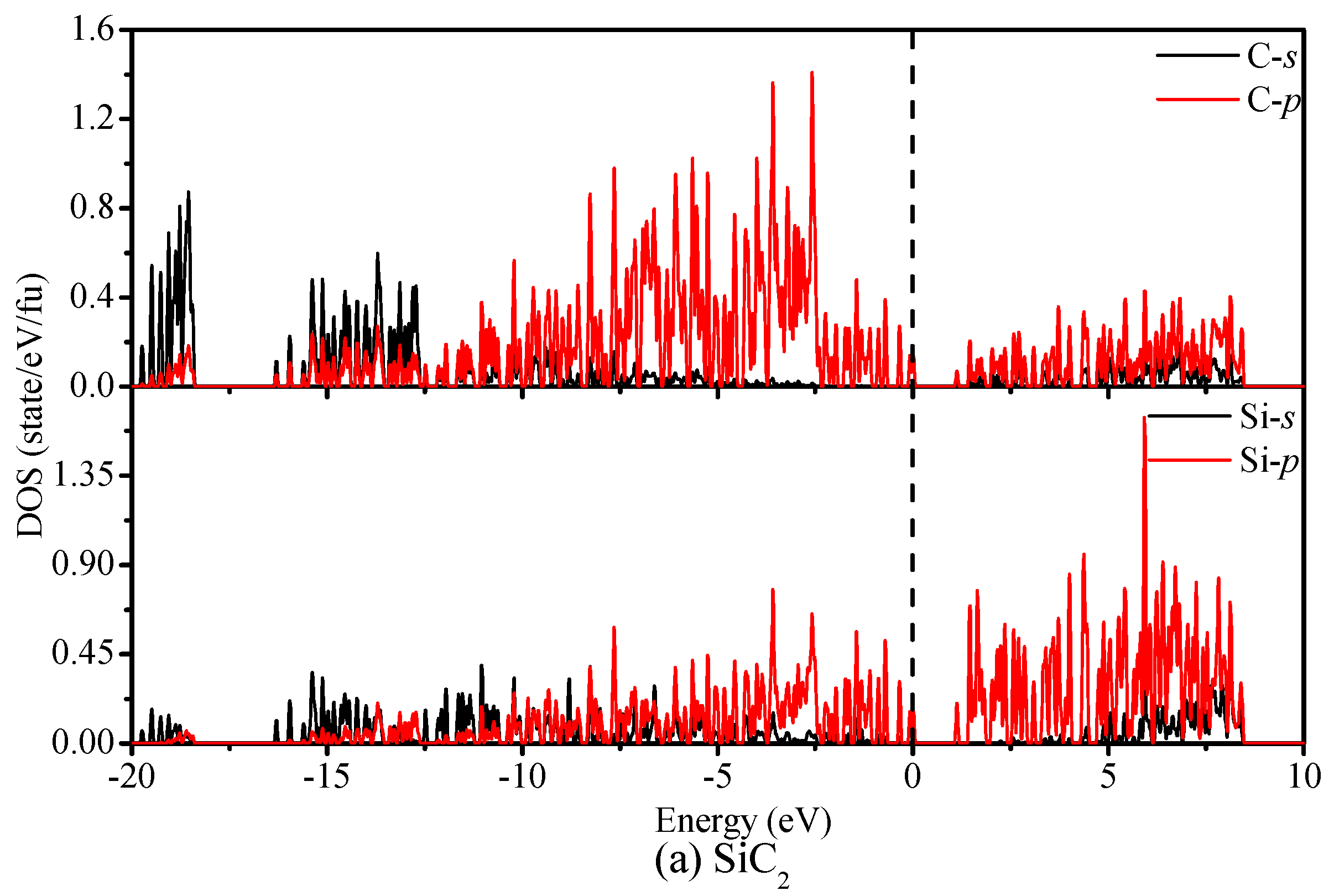 It is well known that the electronic structure determines the fundamental physical and chemical properties of materials. The failure of LDA and GGA to accurately predict the band gaps of semiconducting materials is caused by a functional derivative discontinuity of the exchange–correlation potential, which can be avoided by using the hybrid functional. Thus, we calculate the band structure and density of states (DOS) of SiC2 and SiC4 by using the HSE06 functional, which are illustrated in Figure 5. From Figure 5, we can easily find that SiC2 and SiC4 are semiconductors with a band gap of 0.91 eV and 2.28 eV, respectively. For SiC2, the conduction band minimum (CBM) is at (0.2353 0.2353 0.5000) (Fractional coordinates) along the Z–A direction, while the valence band maximum (VBM) is located at (0.5000 0.5000 0.0714) along the A–M direction (see Figure 5a). For SiC4, CBM is at the D point, while the VBM is located at the G point (see Figure 5b). The direct gap at D is 2.34 eV, which is slightly larger than the indirect gap of 2.28 eV. Thus, SiC4 has a quasi-direct band gap. Figure 6a shows the partial density of state (PDOS) of SiC2; the PDOS is divided into three parts: the first is the energy range from −18 eV to −10 eV, where the contribution from Si-p is very small compared with that of other orbitals, and the main contributions to the upper band are from the C-s orbital. The middle band is in the range from –10 eV to 0 eV; the main contributions in this part are from the C-p orbital and Si-p orbital. The last band has energies above the Fermi level. In the upper band, the contribution from the Si-p orbital is great compared with that of other orbitals for the first place, while for the second, the contribution from the C-p orbital is great. From Figure 6b, we find that the PDOS of SiC4 is similar to that of SiC2. For the energy range from −25 eV to −15 eV, the contribution from C-s is very great compared with that from the other orbitals. For the energy range from −15 eV to 15 eV, the main contribution comes from the C-p and Si-p orbitals.