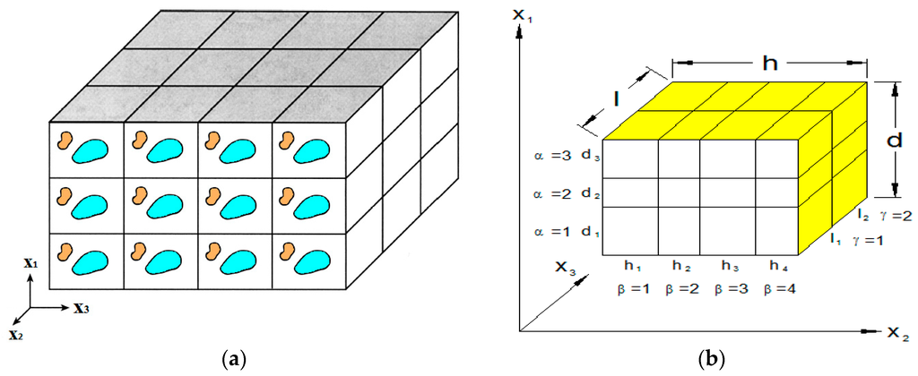 The generalized method of cells is a micromechanical formulation for predicting the overall thermo-inelastic behavior of the multiscale composites. There are four steps involved in this homogenization process [33,44]. First, the RUC should be identified (Figure 1a) and discretized. A typical RUC consists of rectangular subcells ( in the and directions, respectively, as shown in Figure 1b. The individual subcells have the dimensions of , and are related to the unit cell dimensions by: