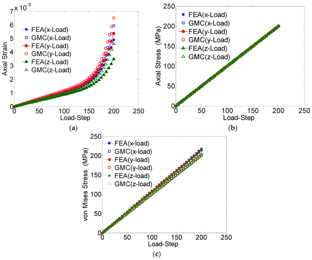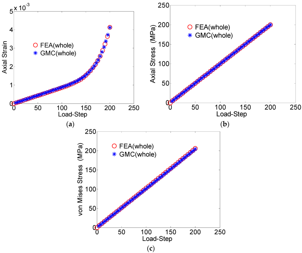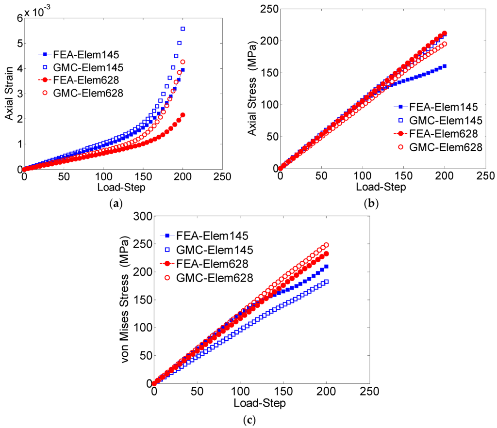 The average axial strain component (εzz), the average axial stress component (σzz) and the average von Mises stress plotted against the load-step for the entire domain are shown in Figure 4a–c, respectively. The average values of the studied field quantities were calculated by taking the volume-weighted average over all the elements. With regards to the average RUC behavior, the GMC results show excellent agreement with the FEA solutions.