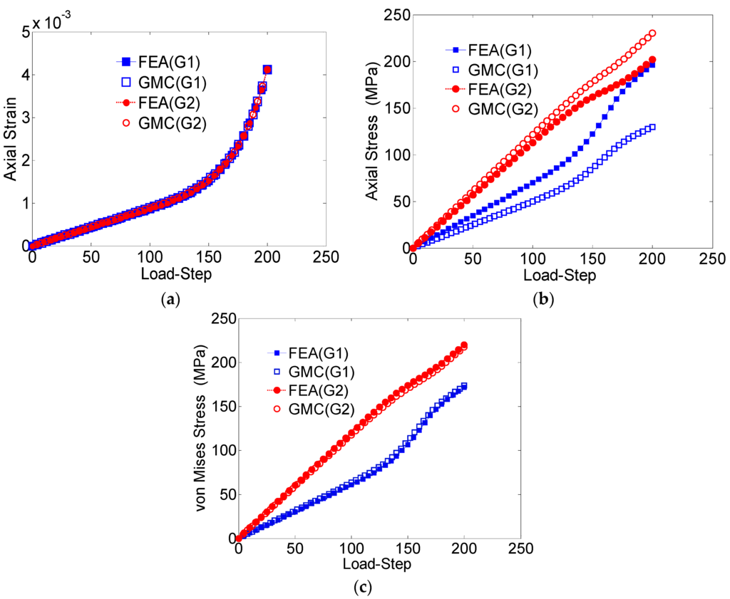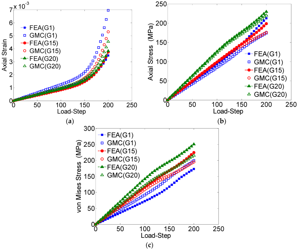 The local microstructural response of the RUC is also studied in Figure 5 by comparing the GMC vs. FEA results with regard to the average element-wise behaviors corresponding to each of the grains for the applied stress load. For the axial stress vs. the load step (Figure 5b), some discrepancy between the reported results from GMC and FEA for each individual grain is observed. The difference is significant in the elastic regime, which contributes to the difference in the overall behavior. On the contrary, the average von Mises stress behavior (Figure 5c), which is a measure of the shear deformation, and the average axial strain (Figure 5a) demonstrates good agreement in both the elastic and plastic zones.
