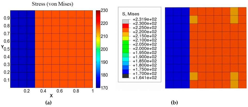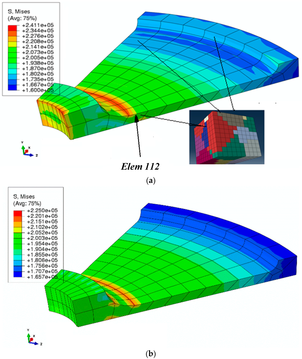 Figure 12a shows the von Mises stress distribution in the disk. To compare the macroscale stress distribution, the von Mises stress distribution obtained by using a standard finite element method (single scale) with a macroscale plasticity model is shown in Figure 12b. In the standard FEA model, the global stress–strain curve obtained from the same 27-grain polycrystal under uniaxial loading was used as the constitutive model. It is important to note that the stress–strain variation per element in the standard FEA follows the element interpolation, while in the multiscale model the GMC can evaluate the stress–strain distribution at the microscale consistent with the interpolated macroscale values of the macroscale finite element.