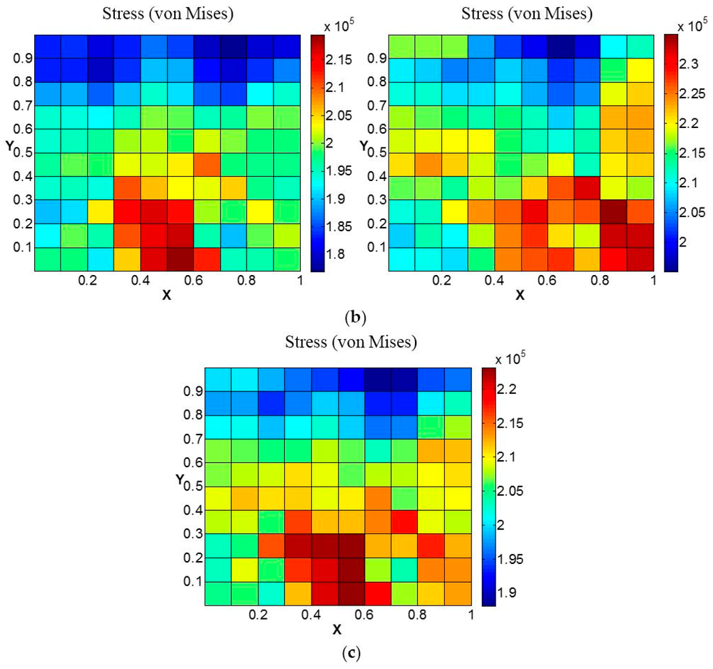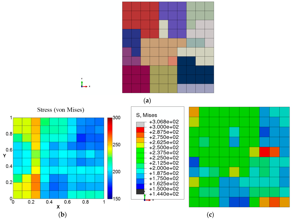 The distribution of the grain orientations on the chosen cross-section of the RUC and the von Mises stress distribution on this cross-section for two of the integration points of a random element (here Element 112) are demonstrated in Figure 13a,b, respectively. In addition, the average von Mises stress distribution for all the integration points chosen on the previously defined RUC cross-section is shown in Figure 13c. The results show that the local von Mises distribution at the grain-level in a real-sized model can be determined using the developed multiscale model, which is extremely computationally expensive, with a standard FEA approach.