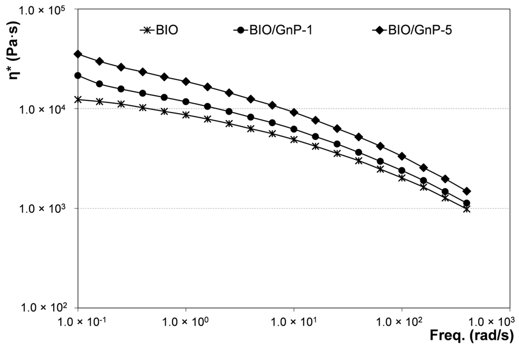 The influence of GnPs on the rheological behavior of the obtained systems was evaluated. The complex viscosity values as a function of frequency are reported in Figure 2 for neat BIO and for the related nanocomposites. The viscosity of the samples filled with GnPs was higher than that of the neat matrix, and it increased with increasing the filler content. Moreover, both BIO/GnP-1 and BIO/GnP-5 exhibited a more pronounced non-Newtonian behavior if compared with the unfilled polymer. At high frequencies, the flow curves of the nanocomposite samples and of the unfilled matrix were much closer among them, although the viscosity values of the nanocomposites remained higher than that of the neat BIO. This rheological behavior is reported in the scientific literature as a typical behavior shown by several nanocomposite systems including polymer/clay nanocomposites [34,35] and polymer/GnPs nanocomposites [36,37]. It is generally attributed to a strong interaction between the dispersed filler and the matrix that restricts the polymer chain movements.