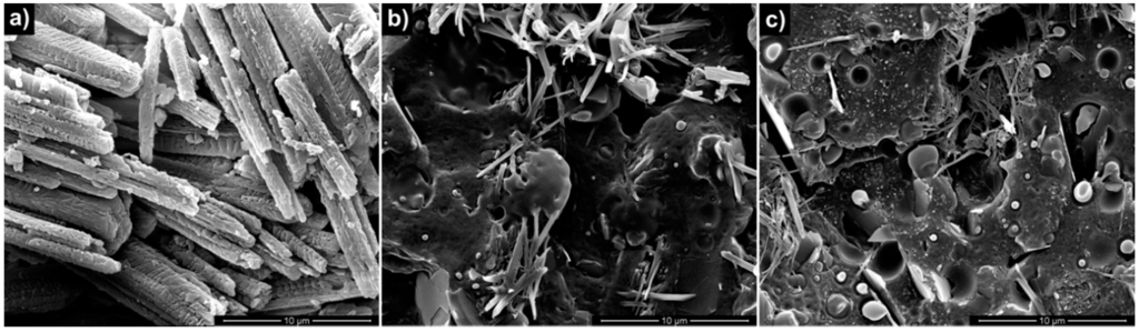 SEM micrographs of: (a) neat CFX; (b) BIO/CFX; (c) BIO/GnP-5/CFX.