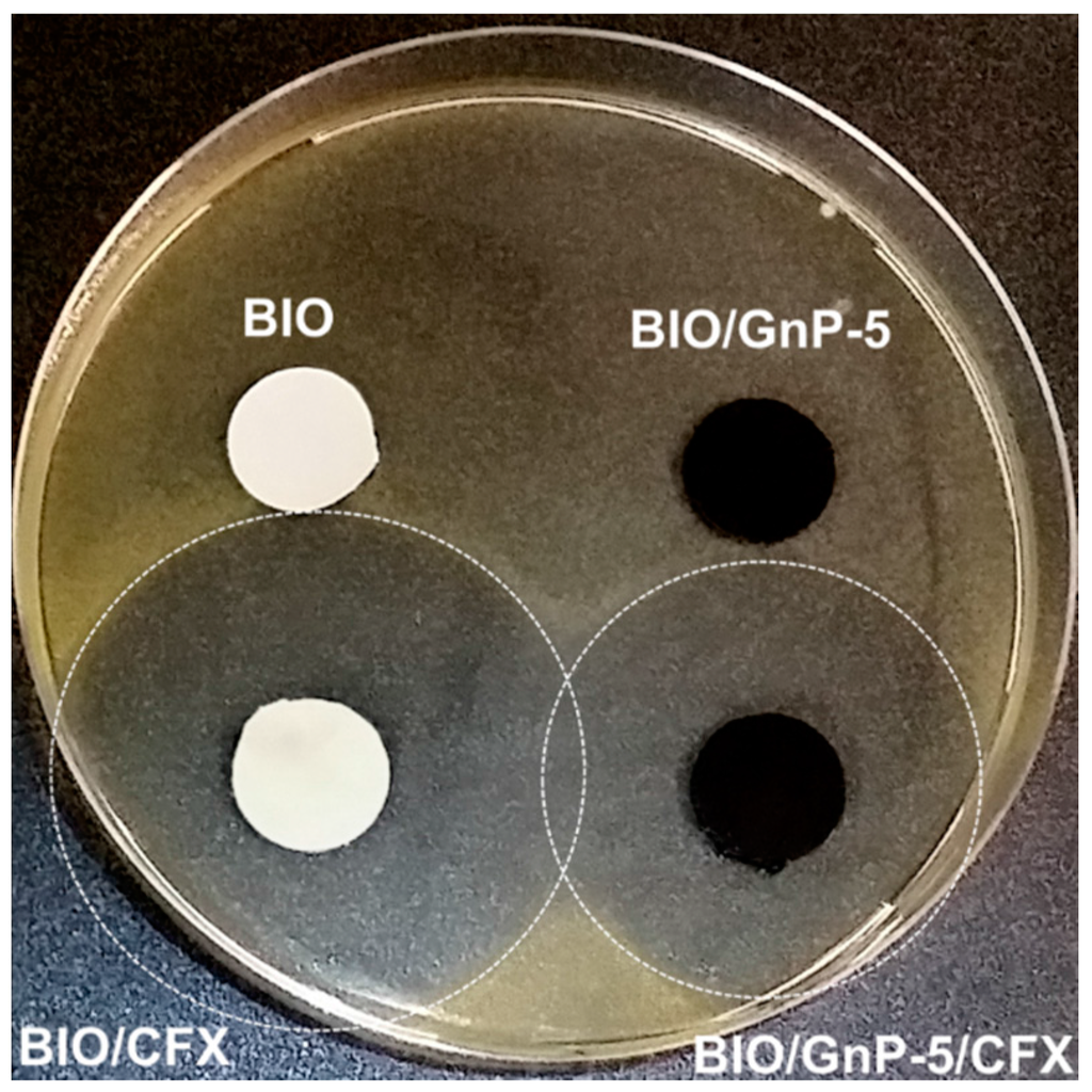 The antimicrobial activity of the materials was determined by the agar diffusion method evaluating the presence of inhibition zones. In particular, Micrococcus luteus ATCC 10240 (ATCC, Manassas, VA, USA) was used as a tester strain in order to study antimicrobial property of the prepared materials. A bacterial suspension of ~109 colony forming units (CFU) was inoculated into 5 mL of lysogeny broth (LB)-soft agar to obtain a uniform bacterial overlay on LB-agar plates. Circular samples (diameter 12 mm) containing CFX at 5% (w/w) were placed over a bacterial tester overlay. Samples without CFX, i.e., BIO and BIO/GnP-5, were used as controls. Bacterial growth inhibition halos were observed after overnight incubation at 37 °C.