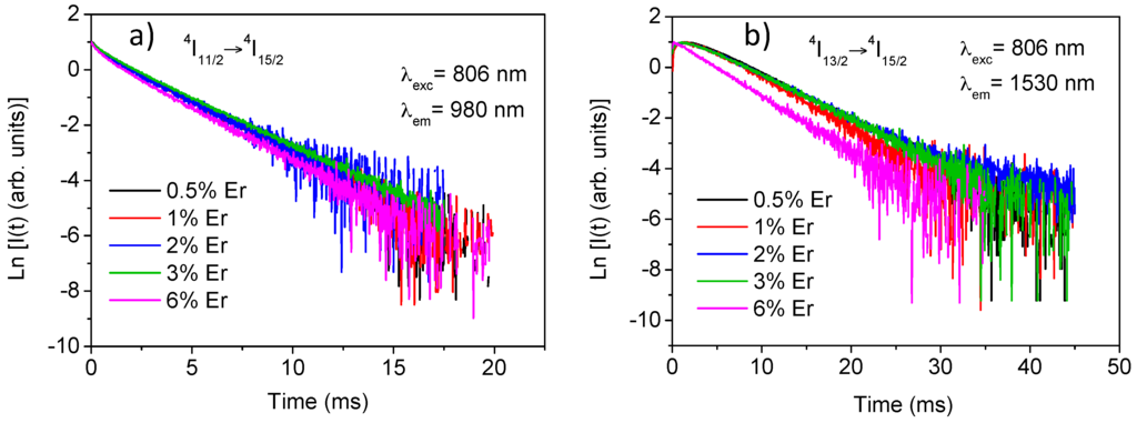 Semilogarithmic plot of the experimental decays of the 4I11/2 (a) and the 4I13/2 (b) levels for all samples obtained under excitation at 806 nm.