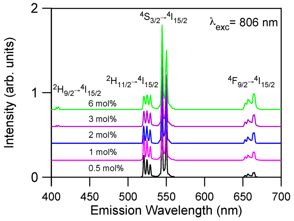 Room temperature upconversion emission spectra under excitation at 806 nm for all concentrations. Spectra have been shifted vertically to ease comparison.