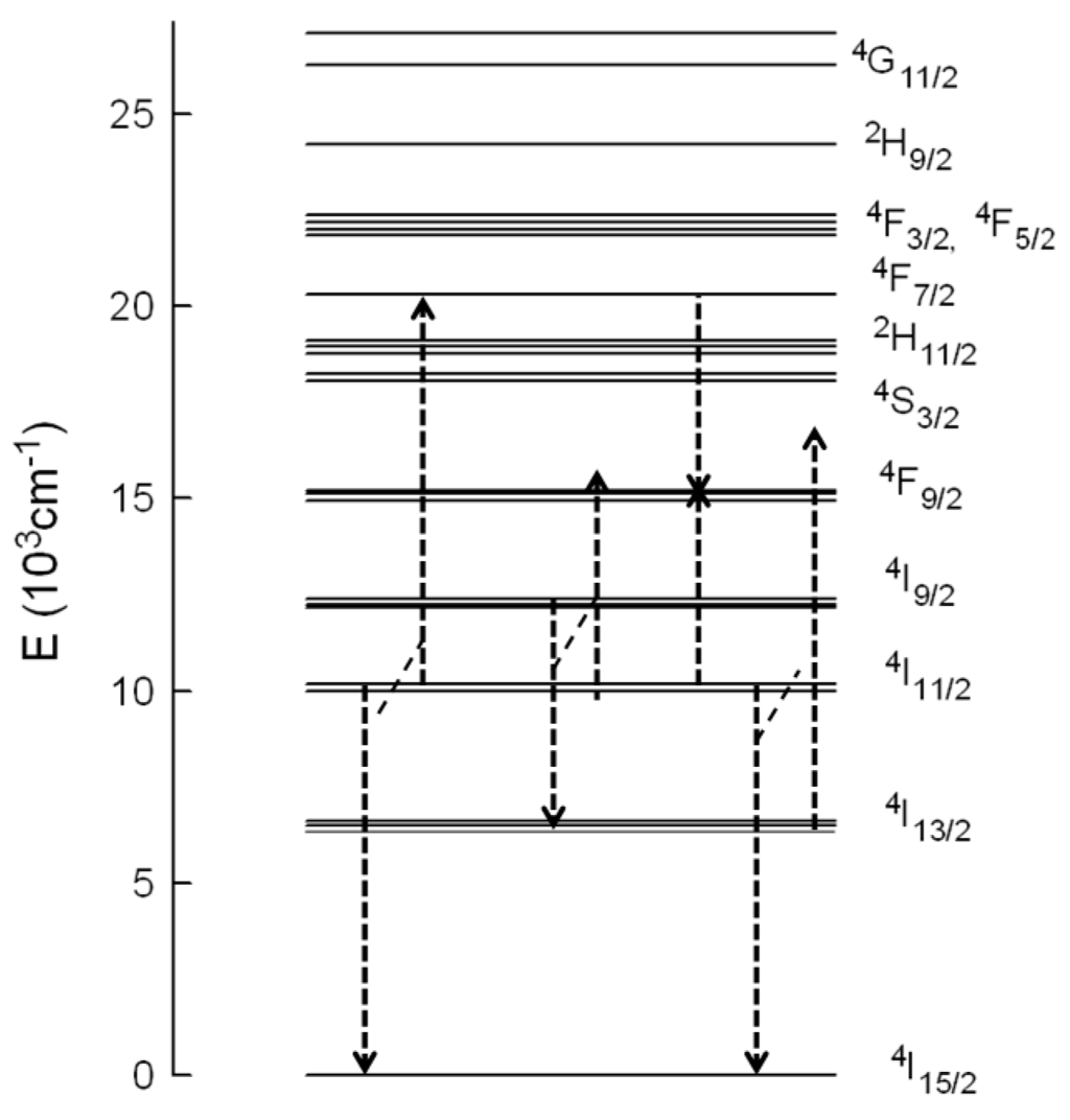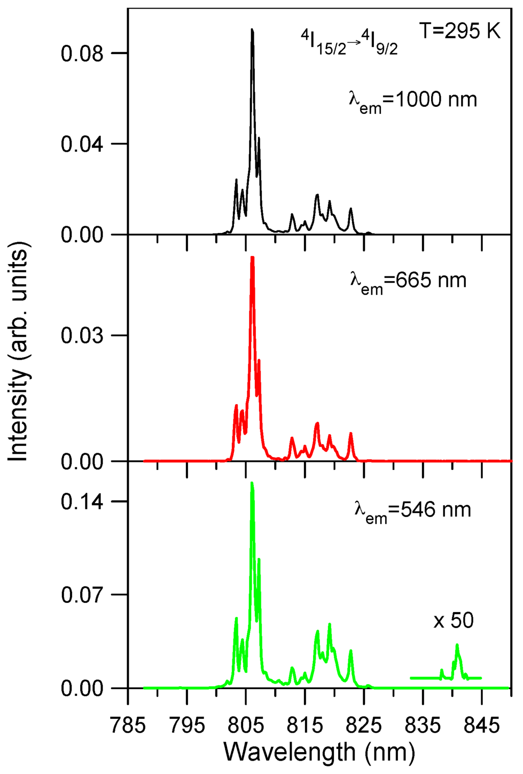 Lifetimes of the 4I9/2, 4I11/2, and 4I13/2 levels obtained under excitation at 806 nm at room temperature. (λem is the emission wavelength).