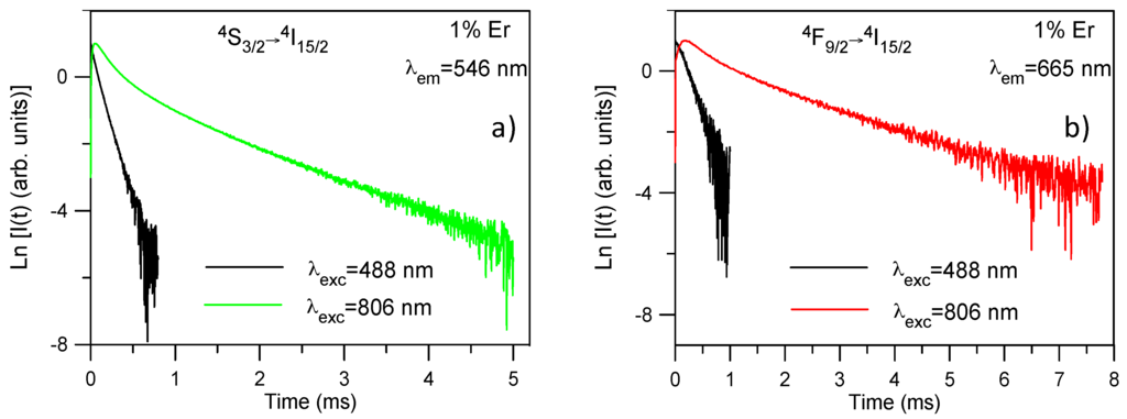 Semilogarithmic plot of the experimental decays of the (a) green emission from the 4S3/2 level and (b) red emission from the 4F9/2 level obtained under excitation at 488 nm and 806 nm.