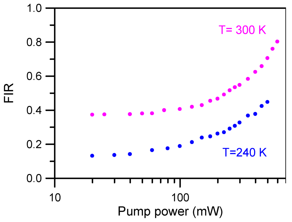 Fluorescence intensity ratio as a function of pumping power at two different temperatures.