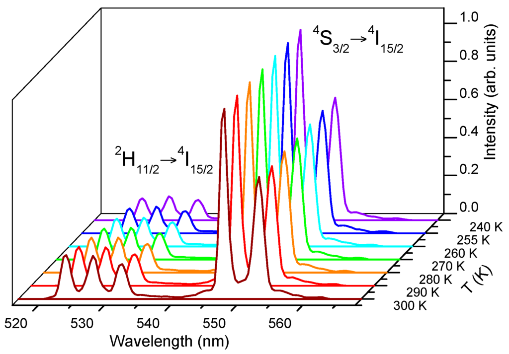 Figure 8 shows the green upconversion emission at different temperatures between 240 K and 300 K obtained under excitation at 806 nm keeping the pump power constant at 40 mW. As the temperature increases, the emission of the 2H11/2 level gradually increases with respect to the 4S3/2 level due to the increase of the population of the 2H11/2 level at the expense of 4S3/2, according to the exponential dependence with temperature given in Equation (1). As can be seen in Figure 9a, the fitting of the integrated fluorescence intensity ratio of transitions from the 2H11/2 and 4S3/2 levels to the ground state with Equation (2) shows a good correlation between experiment and theory. The obtained parameters are Ln(B) = 2.17 and C = 983. The experimental value of ΔE/K is 1017 in good agreement with the fitting parameter.