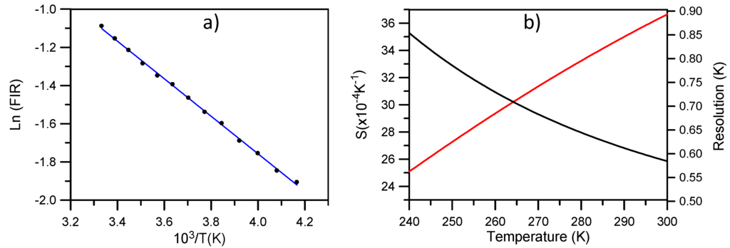 (a) Integrated intensity ratio of the green upconverted emissions as a function of 103/T in the 300 K–240 K temperature range. The solid line corresponds to the fitting with Equation (2); (b) Sensitivity (red line) and resolution (black line) of the FIR temperature sensor based on La2O2S:Er3+.