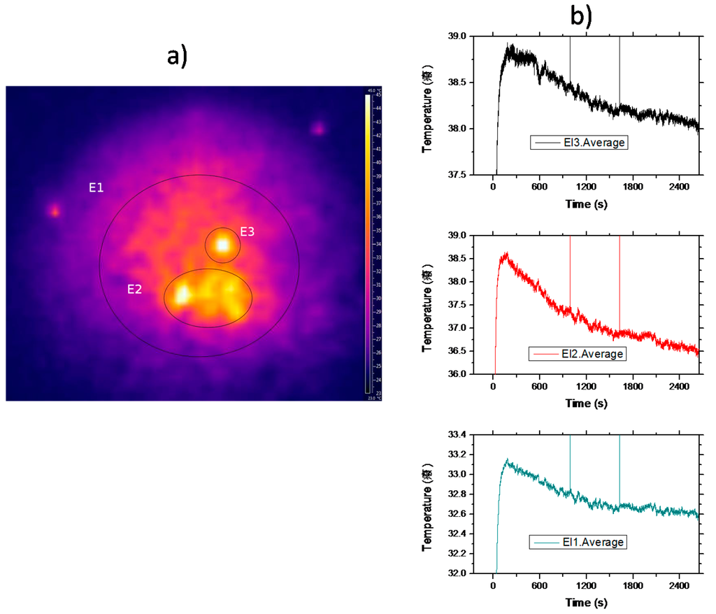 (a) FLIR camera video frame showing discrete thermal zones after pumping with 300 mW at 842 nm in a 2 mol% Er3+- doped La2O2S powder sample; (b) Average temperature as a function of time measured in the three shown zones in (b).