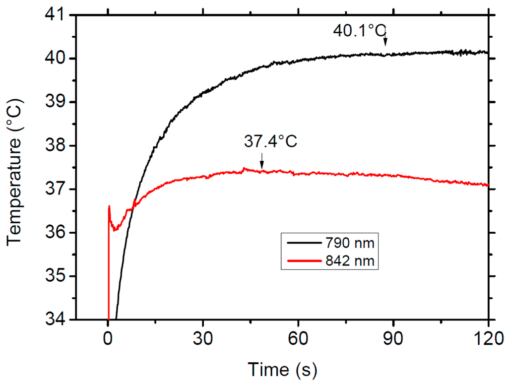 As we have mentioned in the previous section, by using the obtained relationship between the integrated fluorescence intensity ratio of transitions 2H11/2 → 4I15/2 and 4S3/2 → 4I15/2 and temperature, the sample temperature when exciting at 790 nm is 4.1 K higher than under excitation at 842 nm. A similar temperature difference is observed in the thermal response of the sample under excitation in the Stokes (790 nm) and anti-Stokes (842 nm) side of the absorption band. Figure 11 shows the comparison of the thermal response of the sample when excited at 790 nm, in the Stokes side (black line) of the absorption spectrum, and in the cooling region, at 842 nm (red line), under the same experimental conditions with a pump power of 700 mW. The figure clearly shows the different thermal behavior of the sample in the heating and cooling regions.