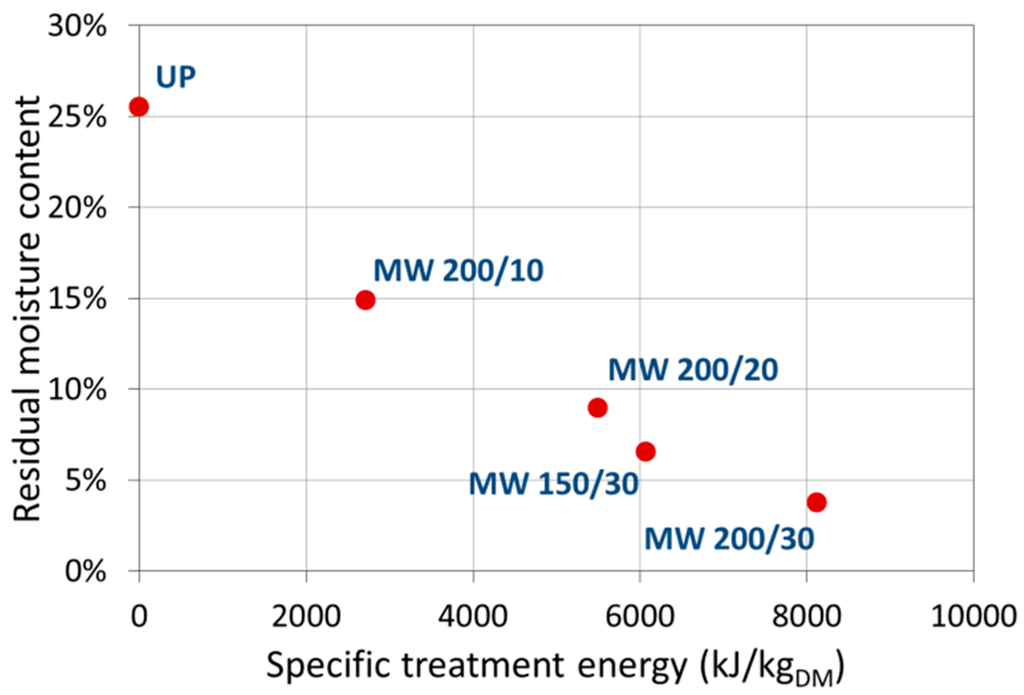 As shown in Figure 1, as expected, by increasing the delivered MW energy (normalized with respect to the dry matter weight of the sample), a quasi-linear decrease in the pollen residual moisture content is obtained, while MW power seems to have little effect.