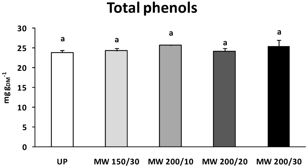 The microwave drying treatment did not negatively affect total phenols content (p = 0.549) which showed instead slight, though not significant, increases in dried samples in comparison to untreated pollen, ranging from 1.5% (MW 200/20) to 7.9% (MW 200/10) (Figure 2).