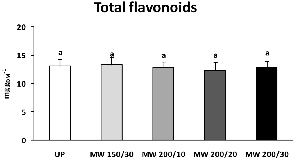 Figure 3 reports the flavonoids content of the untreated pollen sample and of the microwave-dried pollen samples. Similarly to the observations in the case of total phenols, the content of total flavonoids, which accounted for about 50% of total phenols, was not significantly influenced by the microwave drying treatment (p = 0.981). Percentage of variation with respect to the untreated sample ranged from −6.0% to +1.7%.