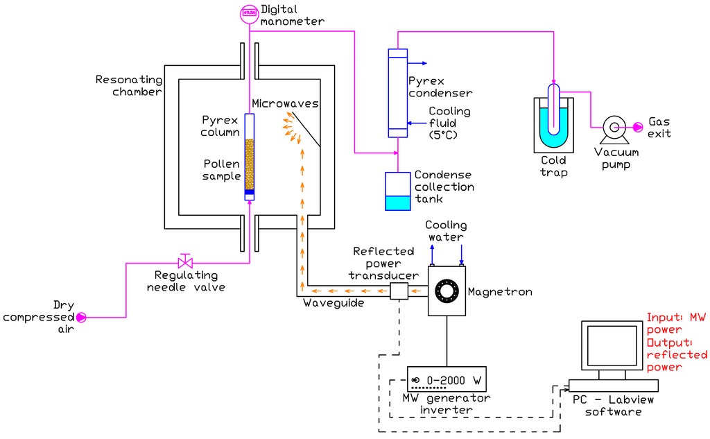 The pollen sample is contained into a Pyrex column (sample holder) which is introduced into the resonating chamber; dry air from a compressor is fluxed at 100 LSTP/h in the Pyrex container bottom through a rotameter equipped with a regulating valve; the air is fed at room temperature (about 20 °C). The condensable gas generated during the treatment with MW (mainly steam) and transported by the air stream is condensed in a Pyrex condenser downstream the sample holder, and the condense is collected in a flask. The gas stream is then sent to a vacuum pump (after passing a liquid nitrogen cold trap) that maintains vacuum in the sample holder; the vacuum is measured by a digital manometer immediately downstream the sample holder.