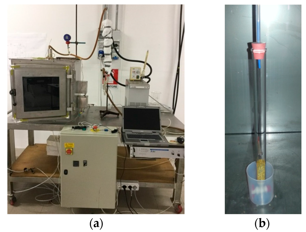 The experimental set-up is shown in Figure 5a. The sample holder is a Pyrex column with total capacity equal to 100 mL, diameter 25 mm and height 270 mm. In the column rubber cap, a hole is realized for gas exit, while dry air enters the bottom of the column via a valve (Figure 5b).