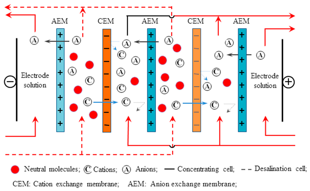 In an ED stack, the dilute feed stream, concentrate stream, and electrode stream are allowed to flow through the appropriate cell compartment formed by the IEMs. Under the influence of an electrical potential, the negatively charged ions (e.g., chloride) in the dilute stream migrated toward the positively charged anode. These ions pass through the positively charged AEM but are prevented from further migration toward the anode by the negatively charged CEM, and therefore persisted in the concentrated stream, which became concentrated with anions. The positively charged species (e.g., sodium) in the dilute stream migrated and passed through the negatively charged cathode i.e., CEM. These cations also remained in the stream, prevented from further migration toward the cathode by positively charged AEMs. As a result of the anion and cation migration, an electric current flow was observed. An equal number of anions and cations were transferred from the dilute stream into the concentrated stream; hence, the charge balance is maintained in each stream. The overall result of the ED process is an increase in ion concentration in the concentrate stream with a depletion of ions from the dilute solution feed.
