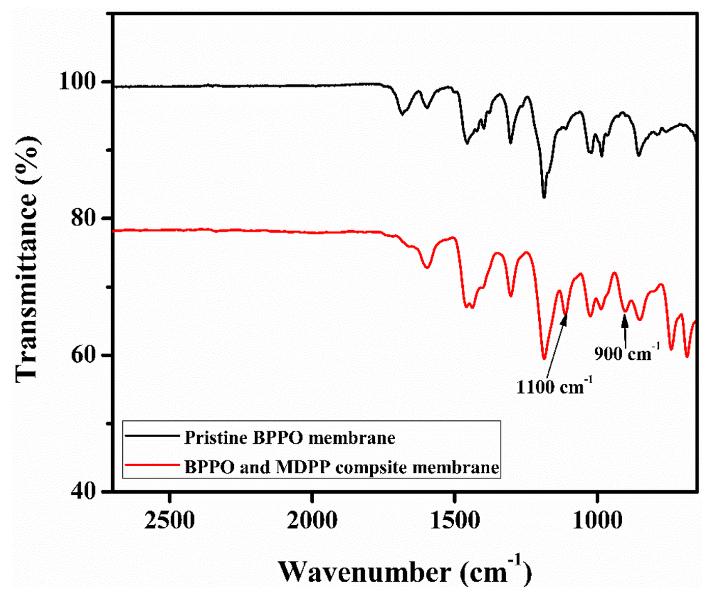 To confirm the synthesis of anion exchange membranes from BPPO and MDPP, FTIR spectra of pristine and composite membranes are shown in Figure 2. The bands in the range of 1446 cm−1 are because of stretching of –CH groups [45]. The adsorption peaks for symmetrical and asymmetrical stretching vibration of C–O are at 1200 cm−1 and 1306 cm−1, and for phenyl groups are at 1470 cm−1 and 1600 cm−1. The attachment of quaternary phosphonium group in the composite membrane was confirmed by the appearance of two characteristic bands at 900 cm−1 and 1100 cm−1. While two sharp intense peaks around 756 cm−1 and 699 cm−1 indicated the presence of benzene rings in composite membranes [46]. These results support the reaction between BPPO and MDPP because, in pristine BPPO characteristics, peaks were absent.