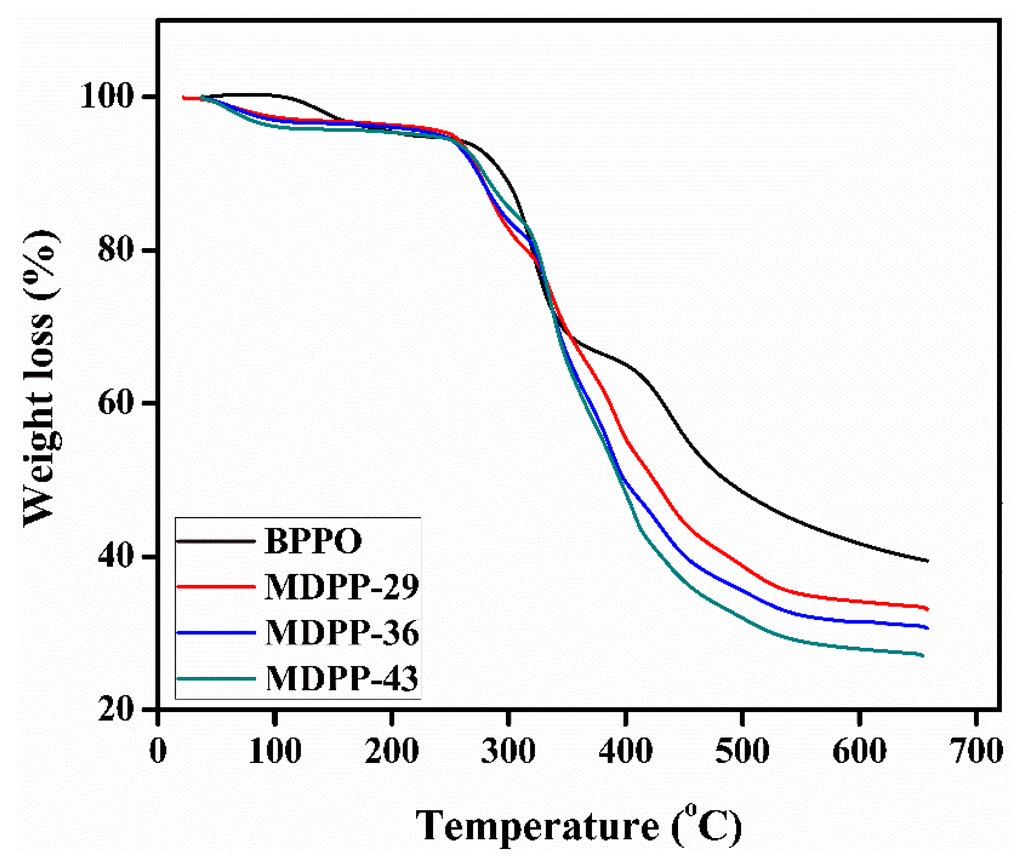 Thermal stability of prepared membranes was studied by TGA nitrogen atmosphere. The results are illustrated in Figure 3. The weight loss of the prepared membranes represented some significant steps, i.e., water loss from the membrane phase, followed by dequaternization and finally the membrane degradation completed the whole process. The first weight loss occurred around 80–130 °C which confirmed the evaporation of residual water from the membrane matrix. The second degradation stage was noticed around 260–270 °C, which is due to the degradation of the quaternary phosphonium group. The final weight loss observed at 430 °C corresponds to the rest of polymer matrix.