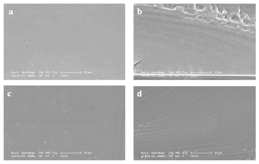Figure 4 represents the SEM images of surface and cross-section of selected membranes. The prepared membranes are smooth and homogeneous, which confirms good compatibility between BPPO and MDPP contents. It is evident from the surface images of prepared membranes that the better miscibility can be obtained by improving MDPP contents. The absence of any holes, pores or cracks at prepared membranes signify homogeneity of membranes. The cross-section of the prepared anion exchange membranes is dense and compact, which can facilitate the electrodialysis process.