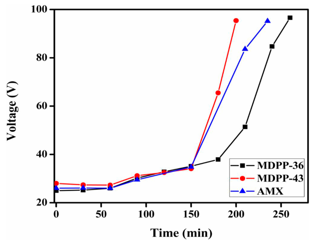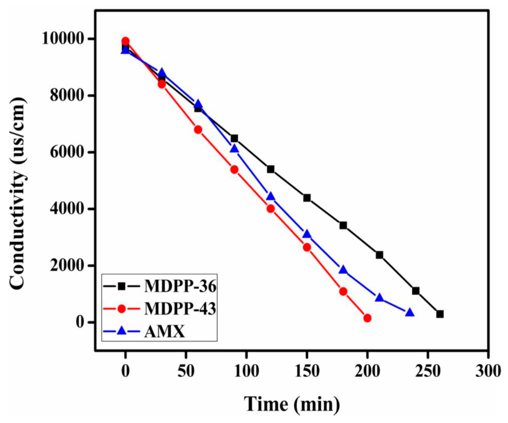After the complete characterization of prepared anion exchange membranes, the two membranes (MDPP-36 and MDPP-43) were tested for the removal of NaCl from its aqueous solution by electrodialysis, owing to their good mechanical properties. ED experiments were conducted by pumping feed solution (0.1 M NaCl) into dilute cells with flow rate of 60 mL/min and direct current of 28 mA/cm2. In dilute cells, the change in conductivity of NaCl with time is represented in Figure 6. It is clear from the figure that both of the membranes show decreases in conductivity with time, which may be due to the increased ion exchange content in the membrane matrix. Moreover, the potential over the stack for prepared membrane MDPP-43 is lower than the other two membranes investigated as shown in Figure 7, suggesting lower energy consumption. Membrane MDPP-43 showed better desalination performance than that of MDPP-36 and commercial membrane Neosepta AMX because Cl− ions migrated rapidly from dilute cells to concentrated cells due to higher IEC and transport number values. Table 4 summarizes the desalination performance of the prepared membranes (MDPP-36 and MDPP-43) and commercial membrane Neosepta AMX. The results confirm that, under the same experimental conditions, the values of current efficiency, flux of salts and the energy consumption for prepared membrane MDPP-43 present better ED performance over the MDPP-36 as well as commercial membrane Neosepta AMX. Therefore, it can best be employed for salt removal from water.