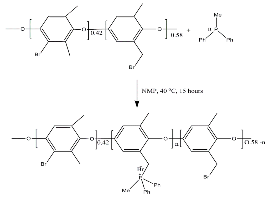 The anion exchange membranes reported here were prepared by the solution-casting method. The casting solution consists of 8% of brominated poly(2,6-dimethyl-1,4-phenylene oxide) (BPPO) in N-Methyl-2-pyrrolidone (NMP) at room temperature. Anion exchange membranes (MDPP-29 to MDPP-43) were fabricated by adding different quantities of methyl(diphenyl)pholsphine (MDPP) into the casting solution to get different properties. The casting solution was stirred vigorously for about 16 h to accelerate the reaction between BPPO and MDPP (methyl(diphenyl)pholsphine). Finally, the solution was casted onto a glass plate and heated at 60 °C (solvent evaporation) for 24 h. The anion exchange membranes were peeled off glass plates and washed with deionized water before characterization and study. Chemical structures for the prepared BPPO based membrane are also represented in Scheme 1.