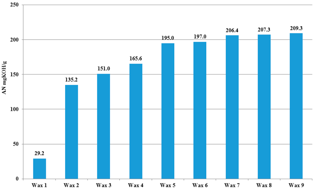 42]. Each analysis was performed a minimum of two times. The obtained results of analysis for the same wax were very similar and the differences for AN were less than 1.0 mg KOH/g. The standard allow for 3% measurement accuracy.