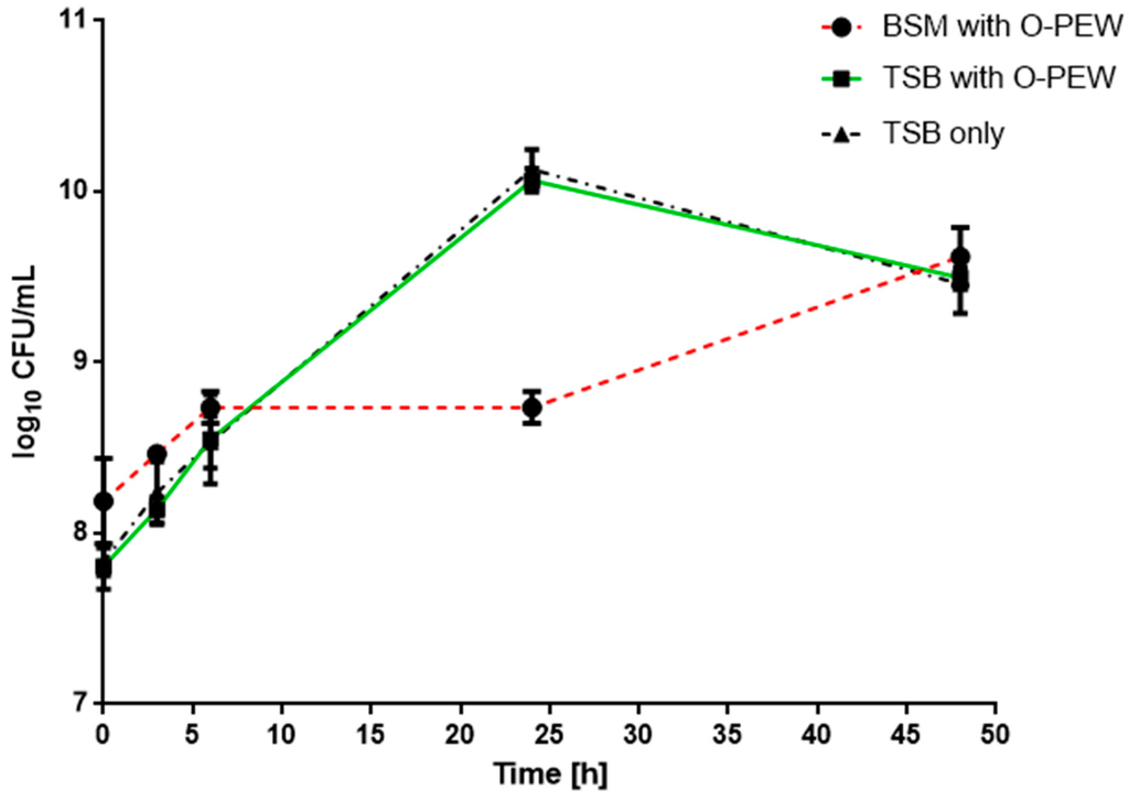 PHA yield and percentage PHA per cell dry weight (1.24 g/L and 33.8%, respectively) were higher in TSB supplemented with O-PEW compared to pure TSB (0.39 g/L and 17%, respectively). Growth and metabolism of O-PEW was confirmed by