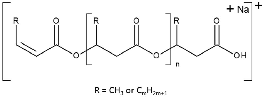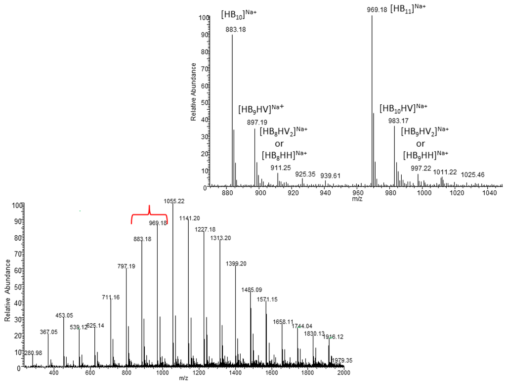 Figure 4 corresponds to the sodium adducts of individual co-oligoester chains composed of 3-hydroxybutyrate (HB), 3-hydroxyvalerate (HV) and/or 3-hydroxyhexanoate (HH) co-monomeric units and were terminated by unsaturated and carboxylic end groups.