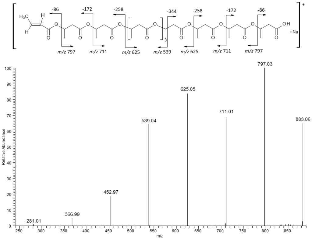 z 897 confirms the presence of 3-hydroxybutyrate and the 3-hydroxyvalerate co-monomer units in polyester chains. Moreover, such a fragmentation pathway indicates that the 3HV unit is randomly distributed along the oligomer chain [