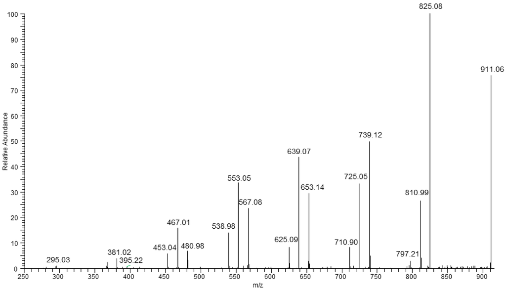 z 911 indicates the presence of more than two co-monomeric units in this oligomer. The ESI-MS/MS spectrum of sodium adduct at