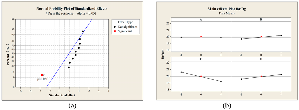 Figure 2 shows the results of the statistical analysis by Minitab. The standardized effect plots are derived from the analysis of the fixed effects model, so the conclusions can only be applied to the factor levels considered in the analysis. The blue diagonal line shows a response that occurs when a factor changes from one level to another, and “not significant data points” means that the points exhibit a lack of influence. As shown in Figure 2a,b, the voltage is the only significant factor affecting the Dg (P < 0.05), and an increase in the voltage leads to a smaller Dg. Figure 2c shows that both the menthol:PLLA ratio and PLLA concentration had a significant effect on the Da with P < 0.01 and P < 0.05, respectively, which indicates that the role of the menthol: PLLA ratio is more significant than that of the PLLA concentration. This is also confirmed by the results of the main effects displayed in Figure 2d, in which the menthol: PLLA ratio (factor A) showed a bigger slope; the Da decreased with an increase in the menthol:PLLA ratio and the smaller the Da, the better for the deposition in the lung, which is favorable for targeted inhalation of the PMs to the lung. Figure 2e predicts that a higher voltage and menthol:PLLA ratio with the PLLA concentration and push speed maintained at a high level can obtain large PMs with a smaller Da. Based on the above results, we chose a PLLA concentration of 3%, menthol:PLLA ratio of 1:1, voltage of 10 kV, and push speed of 50 mm/h as the optimal conditions for the preparation of PMs for pulmonary drug delivery.