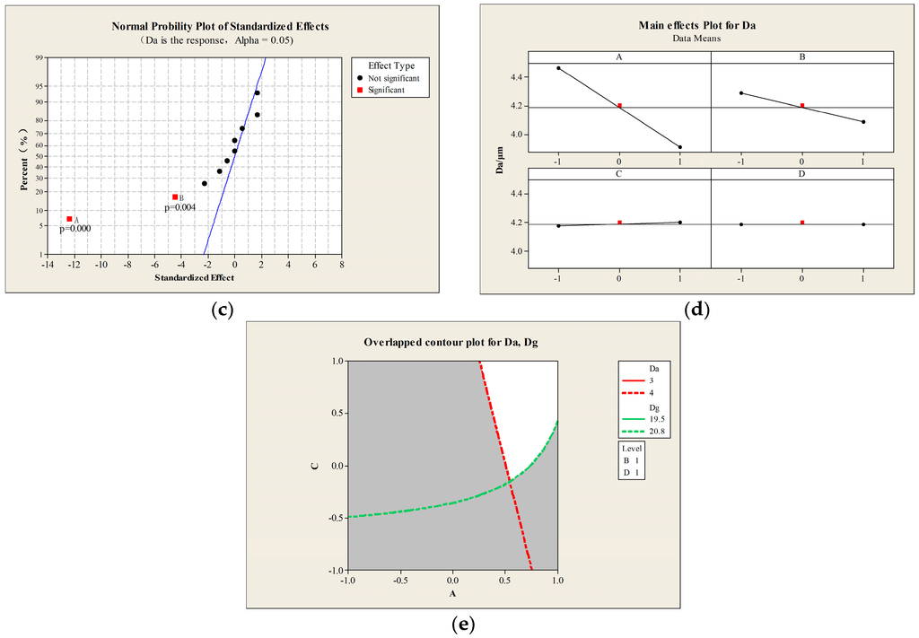 Minitab analysis: (a) Standardized effect of factors on Dg; (b) main effects plot for Dg; (c) standardized effect of factors on Da; (d) main effects plot for Da; (e) overlapped contour plot for both Da and Dg; (A) menthol: PLLA (w/w); (B) PLLA concentration (wt/v, %); (C) voltage (kV); and (D) push speed (mm/h).