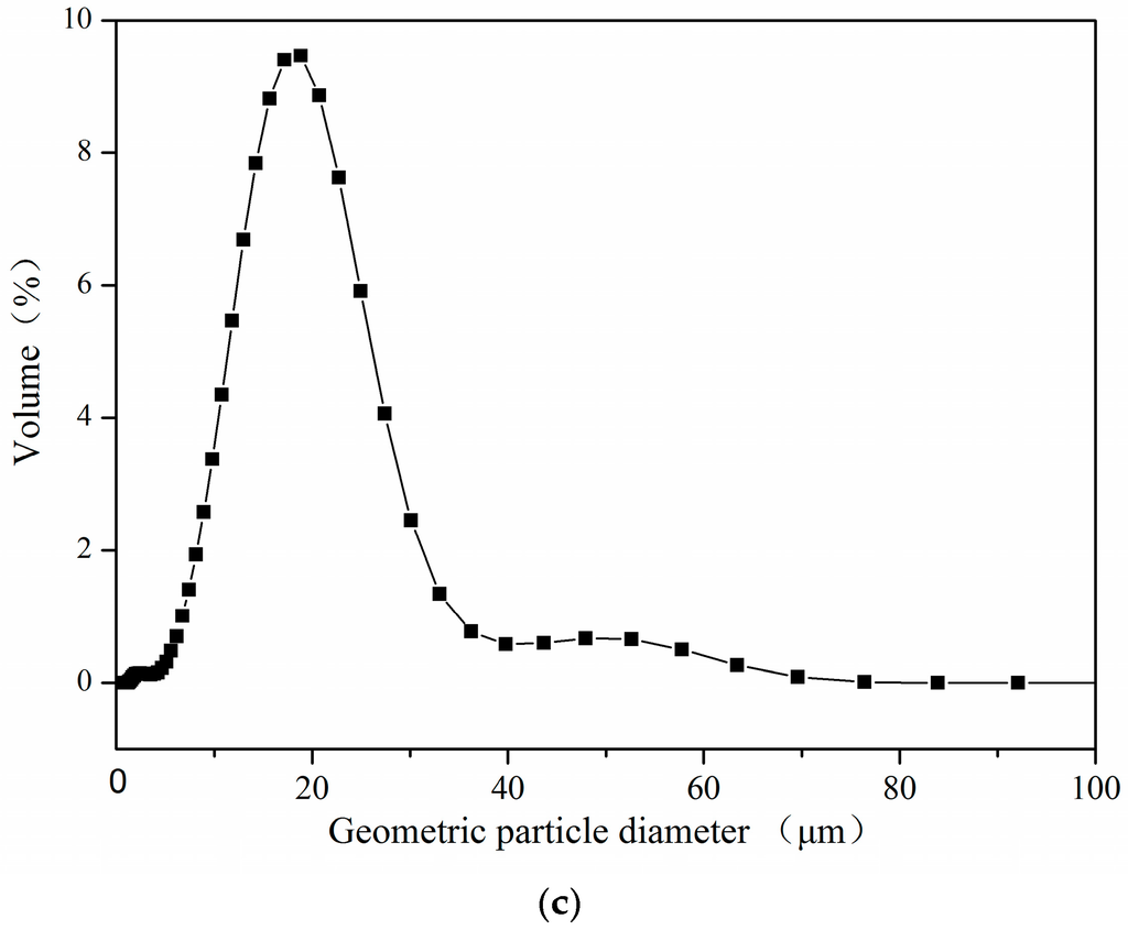 SEM image and particle size distribution of PLLA PMs. (a) ×2 k; (b) ×5 k; and (c) particle size distribution of PLLA PMs.