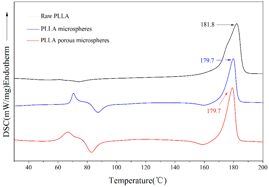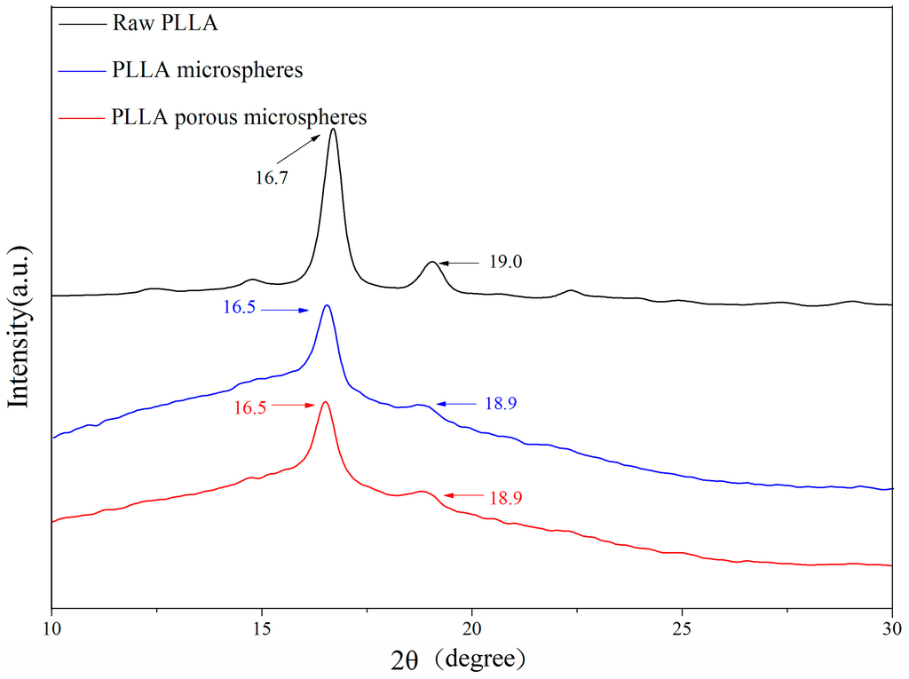Figure 5 shows the XRPD spectra of the PLLA PMs before and after processing. It is found that the characteristic diffraction peaks of the PLLA PMs (16.5° and 18.9°) are exactly the same as those of the solid PLLA microspheres formed without menthol as a porogen, while they are lower than those of the raw PLLA (16.7° and 19.0°). This indicates that the crystallinity of PLLA might be slightly reduced after re-crystallization, which reveals that a minor change in the physical state of the two crystal forms of α and α’ [41,42] occurred during the anti-solvent process, although the chemical component was not altered. This is also related to the results of DSC analysis, as shown in Figure 6.