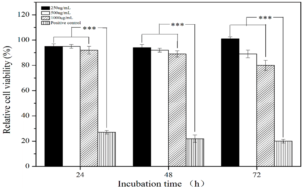 The Alamar blue assay, one of the most common and effective methods for evaluation of the toxicity of biomaterials in vitro, was performed for the cytotoxicity test of the PLLA PMs. Human lung adenocarcinoma cell line A549 cells were cultured in Roswell Park Memorial Institute-1640 (RPMI-1640, Gibco Life Technologies, Waltham, MA, USA), supplemented with 15% (v/v) fetal bovine serum (FBS, Gibco Life Technologies, Waltham, MA, USA) and 1% penicillin/streptomycin at 37 °C and 5% CO2. Briefly, A549 cells were seeded at a density of 5 × 104 cells per well in a 96-well plate and subsequently co-incubated with leach liquors of the PLLA PMs at different concentrations (250, 500, and 1000 mg/mL) for 24, 48, and 72 h, respectively. The negative and positive controls were a blank medium and a medium containing phenol, respectively. After co-incubation, Alamar blue solution (10%, v/v) was added to each well for 4 h’ reaction. Finally, Alamar blue fluorescence examination was carried out at the excitation and emission wavelengths of 570 nm and 600 nm, respectively, and a microplate reader (Spectra Max M5, Molecular Devices, Silicon Valley, CA, USA) was used to measure the absorptions.