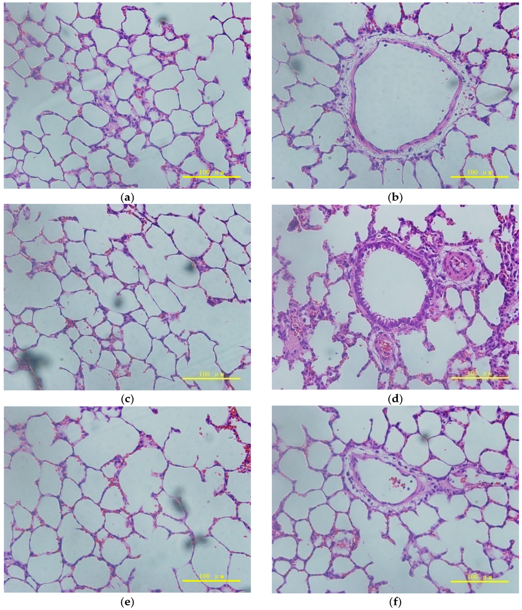In this part, all operative instruments had to be sterilized and disinfected for the treatment of rats. Pentobarbital solution was used at a certain dose to induce a short anesthesia adequate for pulmonary administration of the PLLA PMs to the rats. Dry PLLA PMs (3 mg) were directly administered into the lungs via the tracheas of the rats using a drug sprayer (DP-4-R, Penn-century, Philadelphia, PA, USA) with the help of a dedicated laryngoscope (LS-2-R, Penn-century, Philadelphia, PA, USA). The air group, the negative (untreated), and positive (LPS) controls were also assessed. Afterwards, the rats woke and regained normal breathing, diet, and physiological activity. After 4 h, the rats were executed, and one group of rats had their lungs and tracheas taken out. The specimens were treated with formalin, paraffin embedded, sectioned, hematoxylin and eosin (H & E) stained, and examined under a light microscope (BX51, OLYMPUS, Tokyo, Japan). Another group of rats was used to extract bronchoalveolar lavage fluid for LDH investigation.