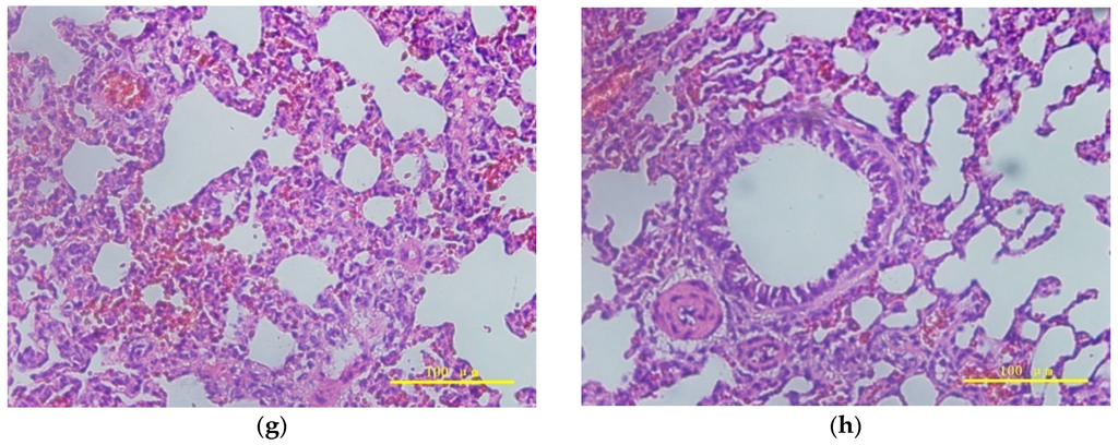 Histological examinations of lung tissues under different treatments: (a) pulmonary alveoli of the untreated; (b) trachea of the untreated; (c) pulmonary alveoli of air; (d) trachea of air; (e) pulmonary alveoli of PLLA PMs; (f) trachea of PLLA PMs; (g) pulmonary alveoli of LPS; and (h) trachea of LPS.