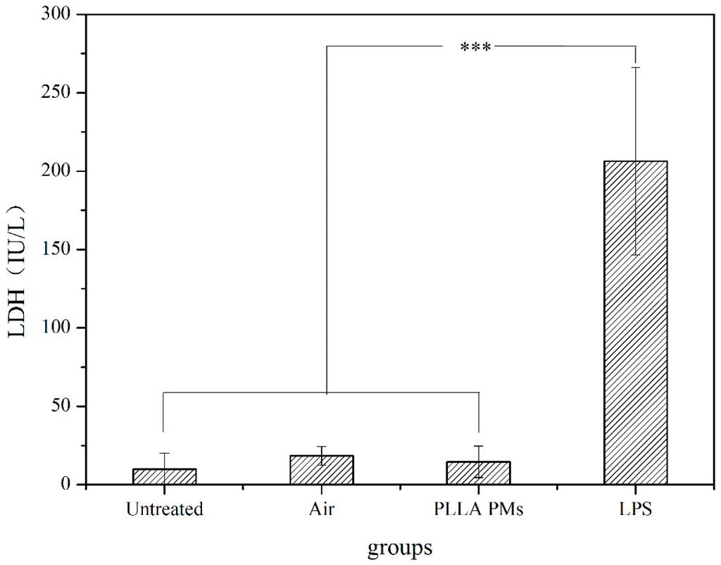Figure 9 shows the LDH levels of different treatments. LDH is a kind of endoenzyme and will escape from the cell when biological tissues are damaged, causing a high LDH level outside the cells. As illustrated in Figure 9, the untreated group had the lowest level of LDH, and the values of LDH increased slightly for the PLLA PMs group and the air group. However, the differences were not significant. These low levels of LDH were caused by the immune responses of the rats, and they were significantly lower than those of the LPS group. This result is consistent with the histological examinations of the lung tissues of the rats.