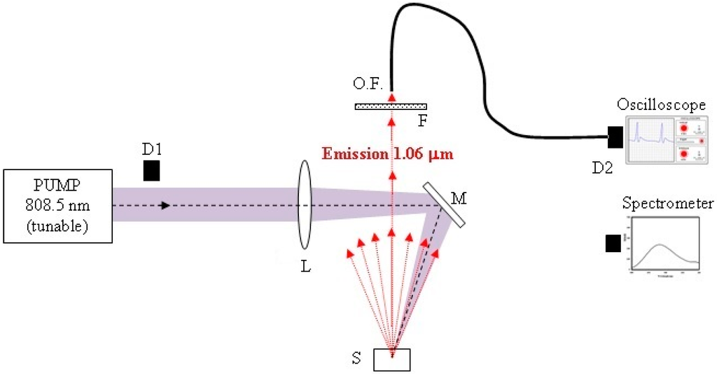 In this work, the authors have obtained a 1.064-μm RL emission at room temperature by pumping around 800 nm (4I9/2 → 4F5/2 transition) onto the free surface of a 1 mol % Nd-doped YAG crystal powder sample by using a simple experimental setup with no additional mirrors [32,33]. We measured some of the basic features of RL emission: the absolute stimulated emission energy versus pump energy and the pump threshold energy as a function of pump spot size and pump wavelength. In spite of the low dopant concentration, an absolute slope efficiency of about 20% has been achieved. The slope efficiency and the pump threshold energy per unit area are constant in a wide range of pumped areas.
