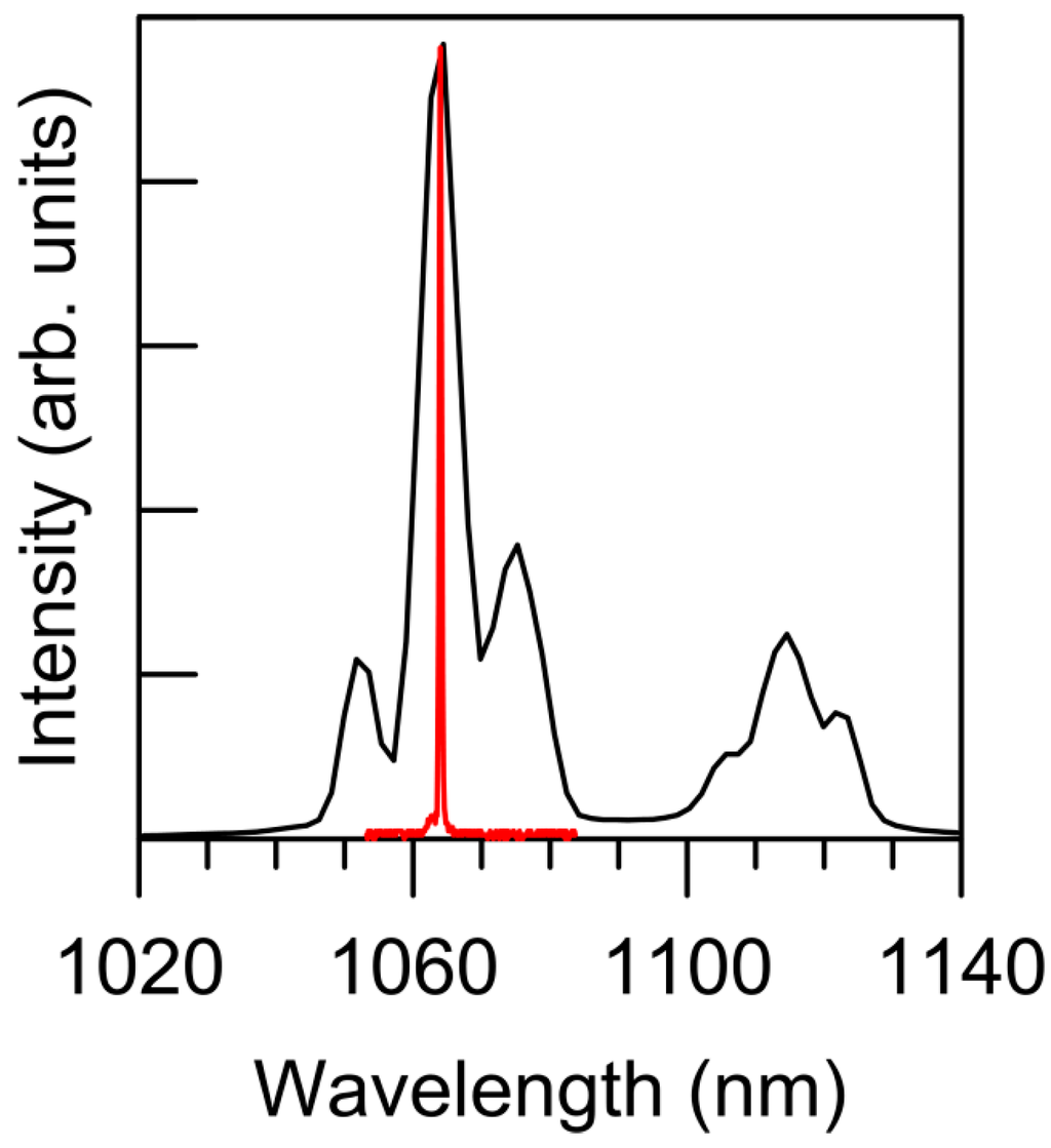 Spontaneous (black line) and stimulated (red line) emission spectra of Nd:YAG crystal powder (stimulated emission intensity is several orders of magnitude higher).
