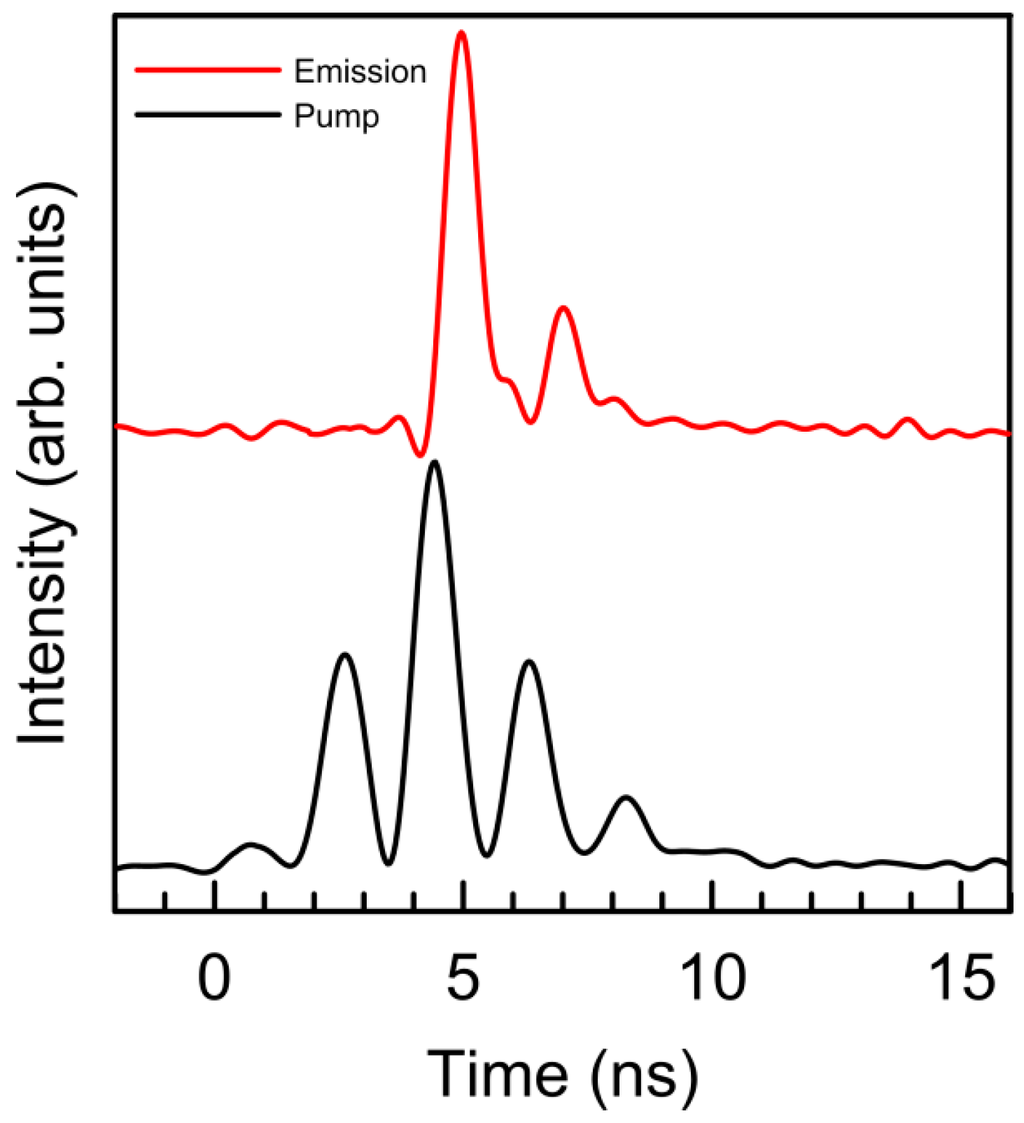 As an example, Figure 4 shows a pump pulse and the corresponding stimulated emission pulse as a function of time. As can be seen, at the forward side of the pump pulse, no stimulated radiation is emitted, because the pump energy is being absorbed to reach the threshold level of the population inversion (pulse buildup time). After that, the RL intensity follows the pump intensity fluctuations with a delay of about 500 picoseconds.