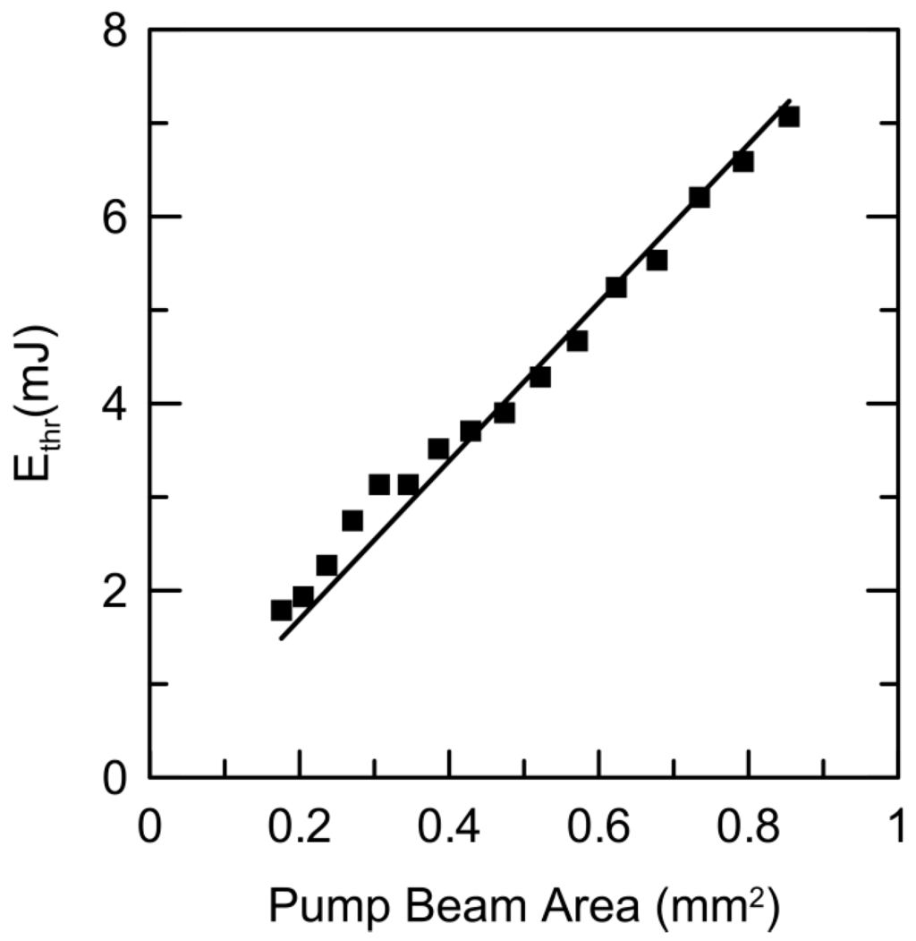 On the other hand, the experimental pump threshold energies shown in Figure 5 (4.0 and 7.1 mJ) divided by their respective pump areas (0.48 mm2 and 0.85 mm2) approximately yield a constant value of 8.3 mJ/mm2. The constancy of the pump threshold energy density (pump energy by unit area) seems to be valid as far as a focusing limit is avoided. This result also agrees with some of our previous results [32,33] but is not so clear in other references in the literature, as, for example, in [37,38].