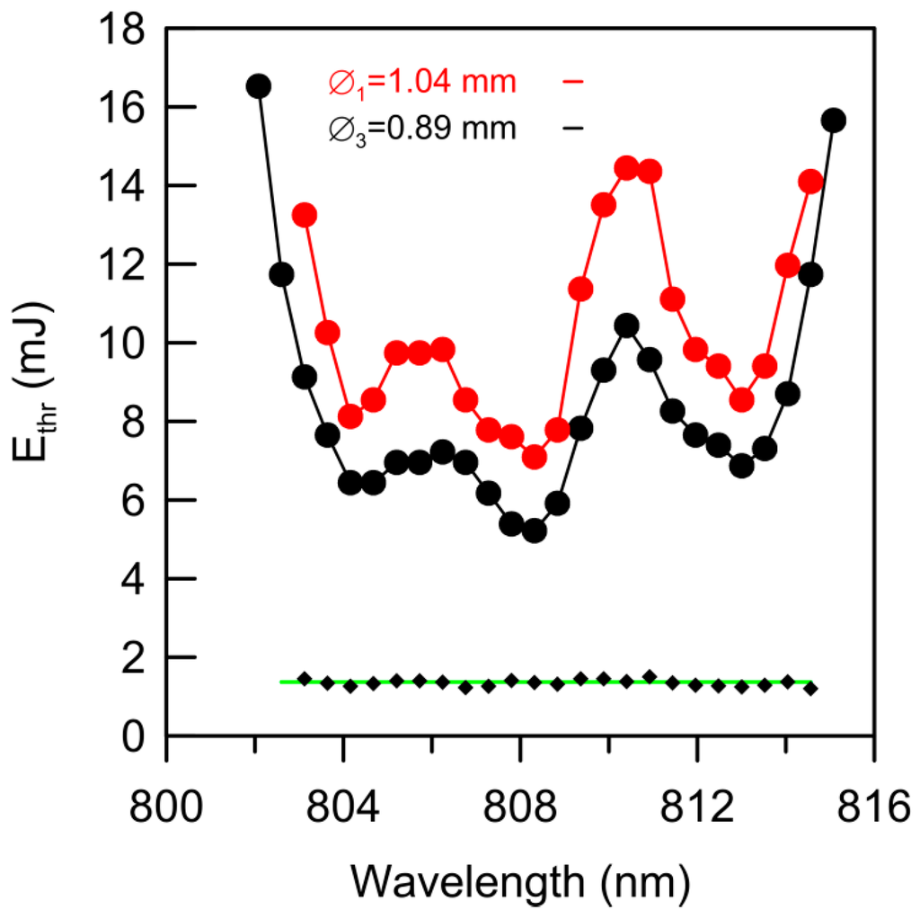 Finally, Figure 7 shows the threshold pump energy as a function of the pump wavelength at two different pump beam diameters: Ø1 = 1.04 mm and Ø3 = 0.89 mm. As can be seen, the shape of both curves follows the absorbance variations shown in Figure 1. The bottom of Figure 7 shows the fitting of the calculated ratio between both curves (black diamonds), which is nearly constant and close to the ratio between both pump beam areas (1.37, green line). This result clearly demonstrates again that the pump threshold energy density is a constant, provided that the pump beam is not excessively focused.