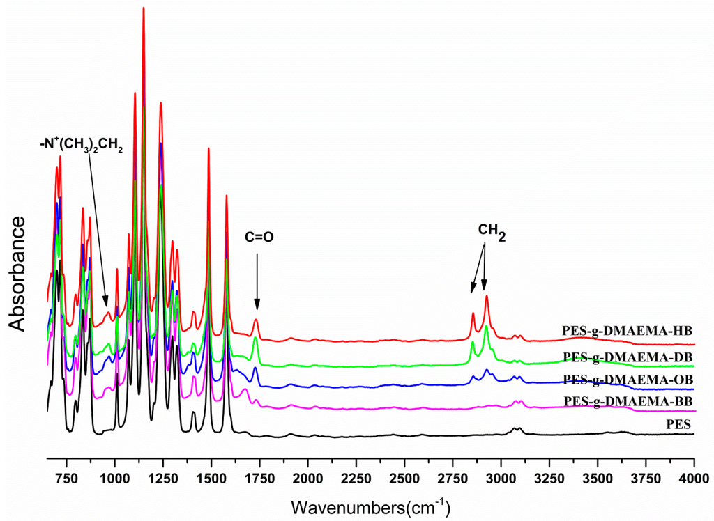 ATR-FTIR of the initial and modified PES membranes prepared with four quaternary ammonium salts monomers.