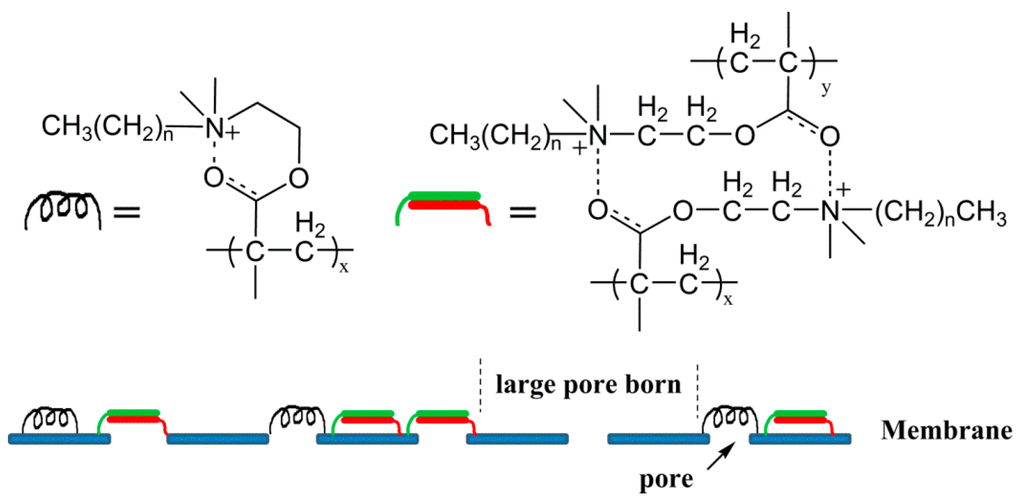 The surface morphologies of various membranes were investigated by SEM, as shown in Figure 4. Compared with the initial PES membrane, the pore amounts of the modified membranes significantly reduced, because the QACs monomers or polymers covered the surface. Although PES-g-DMAEMA-BB and PES-g-DMAEMA-OB had lower GAs (193.6 μg/cm2 and 203.8 μg/cm2, respectively), the pore amounts decreased dramatically. On PES-g-DMAEMA-BB and PES-g-DMAEMA-OB surfaces, the small size pores (diameter < 1.0 μm) almost disappeared and a few large size pores bore. We suppose that the QACs have both an electro provider (C=O) and receiver (quaternary ammonium), so the hydrogen bonds could be created inter- or intramolecularly, as shown in Figure 5. This might lead the monomers or polymers assembling and blocking the pores on the membrane surface. As a small number of DMAEMA-BB and DMAEMA-OB were grafted on the membrane, the assembly could not cover the whole surface and left a skin with many large-sized pores. When the alkyl chain on the quaternary ammonium group increased (as dodecyl or hexadecyl), the steric hindrance grew up and eliminated the reaction between C=O and quaternary ammonium. As a result, the QACs were grafted equally on the surfaces. Figure 4 shows that most pores were kept on the PES-g-DMAEMA-DB and PES-g-DMAEMA-HB.